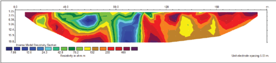 A combined interpretation based on both SP and resisitivity imaging data sets can be particularly valuable. Whilst the SP responds well to the seepage it does not deliver information on structure or saturation levels, so this is where the other results will fill in detail. The resistivity survey can provide information on both the surroudning geological setting and the internal layers and construction features of the dam plus, in some situations, estimates of porosity and pore water salinity and/or saturation.