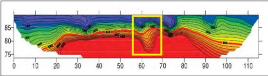 Figure 4. ERT profile along dam crest clearly shows zones of increased water saturation (blue zones).