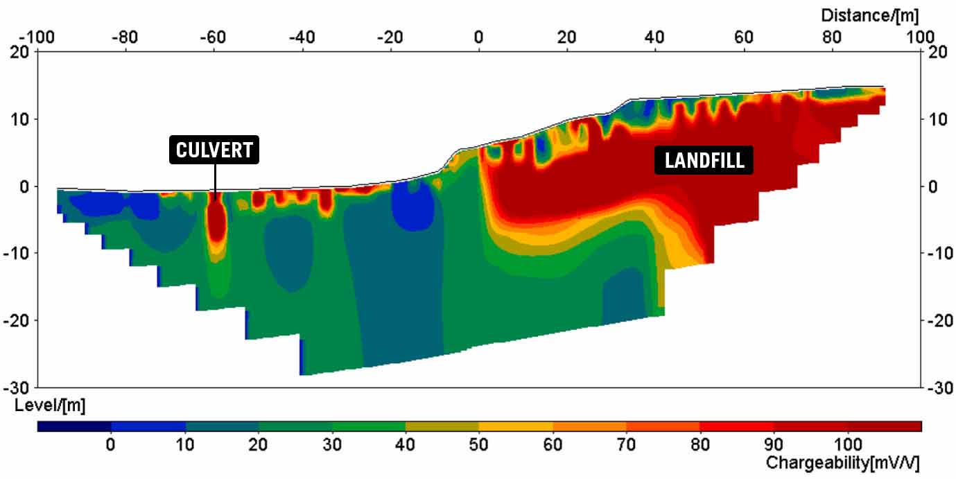 Note! All ABEM resistivity equipment is capable of also recording the chargeability of the ground (how quickly it charges up and subsequently discharges with the application and removal of current) using time domain induced polarisation methods. This additional dataset can be very useful in mapping different types of waste in a landfill, or interpretation of targets such as mineral deposits and clays.