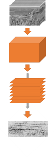 The images below show how depth slices for GPR data are created (they are also sometimes called time slices). Note that geophysical data, from both seismic and GPR investigations, always should be migrated before the depth slices are created.