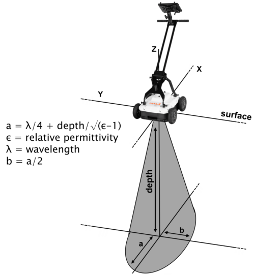 The dielectric constant, together with antenna frequency and measurement depth, also controls the signal footprint of the GPR antenna. A GPR does not only measure what is directly below the GPR antenna but also what is in front, behind and to a less extent to the sides of the antenna. The size of the footprint at different depths will define the size of the objects that you can image. The signal footprint is smaller closer to the surface and will spread out as it travels deeper.