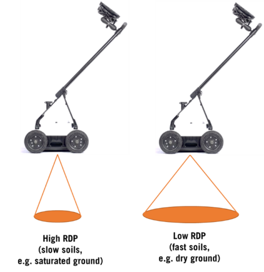 Note If the signal travels between two materials with different RDP values the size of the cone of transmission can become more or less focused. For example, if the RDP (relative dielectric permittivity) of the encountered medium increases, the beam of transmission will be focused and if the RDP decreases the beam spreads out. On a survey site with multiple layers of differing RDP values the transmission beam will change shape with depth.