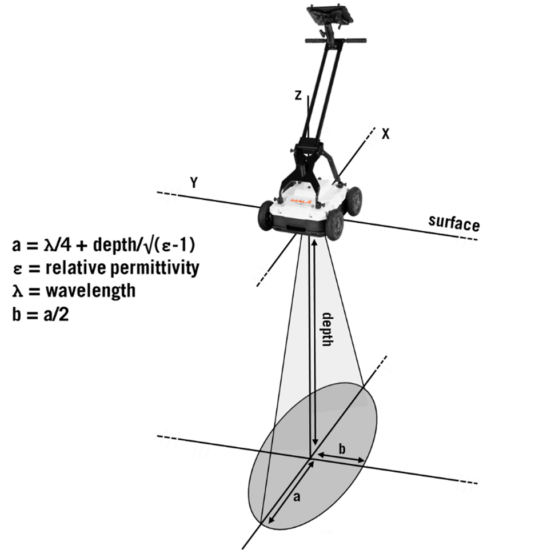 The footprint of a GPR describes the radiation pattern form, emitted by a GPR antenna. The size and shape of the footprint is, apart from the antenna design itself, dependent on the dielectric constant at your survey site together with the antenna frequency and the measurement depth of your target (see image).