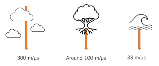 Air is the fastest media with a velocity of 300 m/µs (or 0.3 m/ns), while water is the slowest media, with a velocity of 33 m/µs (or 0.033 m/ns).
