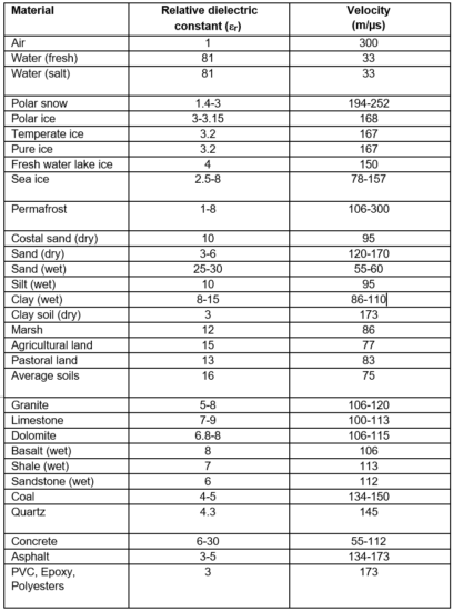 In the table below you find some common velocities for different wet and dry material. It is important to remember that tabled values are only to be used as guidance. The actual velocity at site will vary depending on local conditions, weather and season. It is crucial to perform proper velocity estimations at the beginning and during every GPR survey.