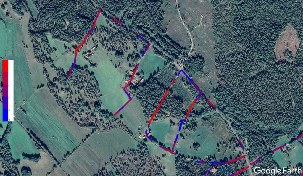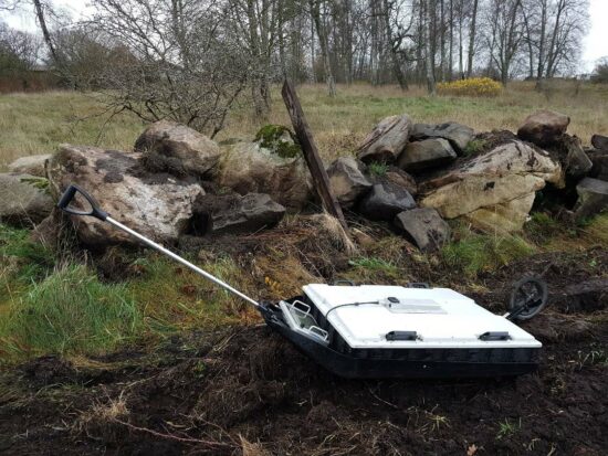 As it was estimated that the bedrock should be found rather deep, more than 10 meters, the GPR measurements were carried out with the MALÅ GX80 system, which in non-conductive conditions can reach 30-40 meters into the ground. The field measurement was done with the pulling kit for easy work in forested terrain, but the antenna was also pulled behind a car along small gravel roads. The measurements were done with a 5 cm trace interval and a time window of 740 ns. The investigation comprised approximately 7700 meters and were carried out during 2 field days.