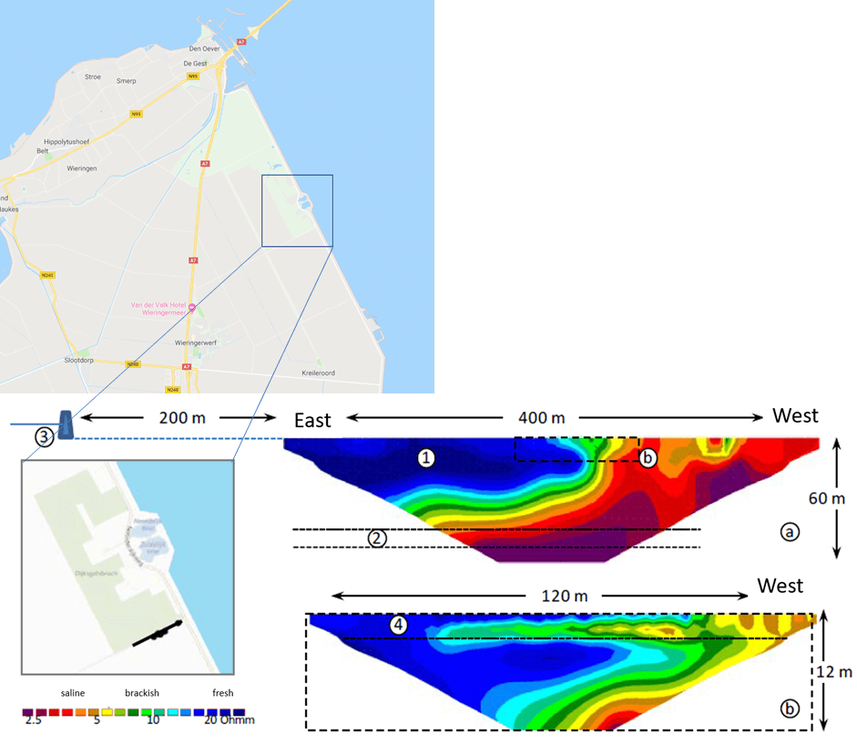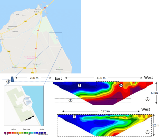 The ERT measurements have helped the Dutch waterboard with an improved understanding of the desalinating process that is taking place: the fresh water moves with an average speed of around 6 m per year in the aquifer, while desalination of the clay layer occurs at a slower rate. This case story shows that ERT measurements are very suitable for measuring the fresh/saline dynamics in sedimentary formations. With the different ERT lengths, both large scale processes and detailed aspects of these processes can be made visible with the ERT measurements.