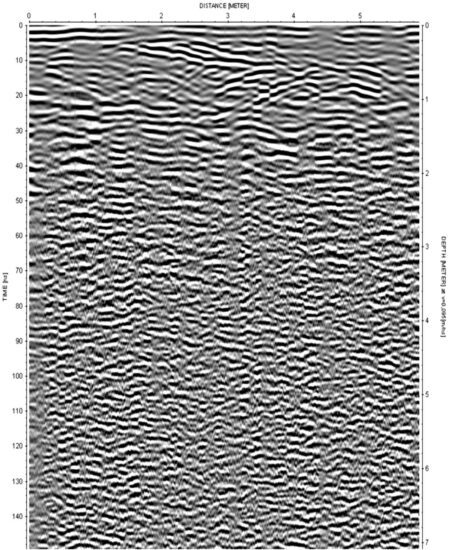 Example of a radargram. Some hyperbolas, indicating objects, can be identified in the upper 2 meters. Due to the conductive filling in the top layer the depth penetration was quite limited