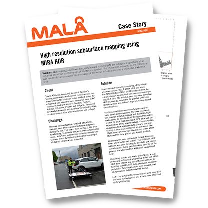 Since detailed subsurface mapping of the whole area was needed, MALÅ MIRA HDR was used. The MALÅ MIRA HDR is a GPR array solution, i.e. a multichannel system with very dense channel spacing (6.5 cm). The solution uses real-time sampling HDR technology, measures 22 parallel GPR lines simultaneously and delivers high resolution data of the subsurface.