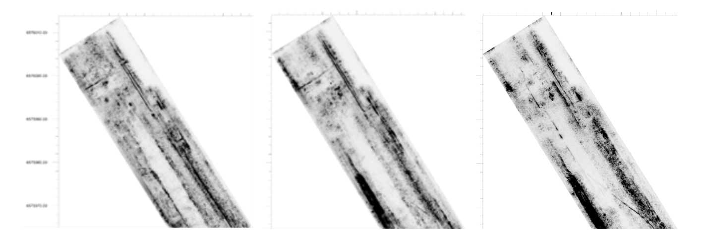 Raw data to show the extent of the investigation area. Already in raw data subsurface features are clearly seen. The marked areas (red) are shown in more detail below.