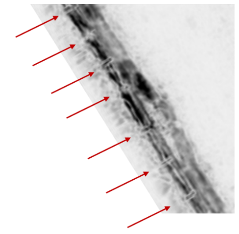 Detail of two parallel larger utilities where one has connectors (red arrows), at approx. 2 meters separation.