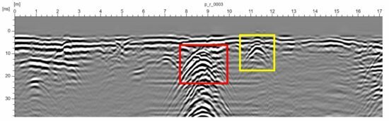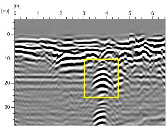 The fiber optic duct is clearly seen in the middle of the resulting radargram, marked in yellow