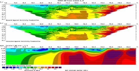Processing of data was made with Res2DInv, a 2D inversion software for both ERT and IP data. The results were shown as 2D sections of the inverted resistivity and chargeability for all 27 investigated profiles. Data were further interpreted by categorizing the resistivity values with customized colors, for different geological settings.