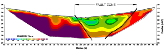 An example of a resulting ERT profile show a 400 meter transect, set out perpendicular to an expected fault running through the site. The electrical resistivity data revealed an anomaly extending from depth to near surface which was interpreted as the lateral position of the fault.
