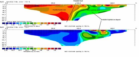 Example of an inverse model resistivity and chargeability section, where low resistivity zones associated with high chargeability values are considered a probable sulfide ore deposit.
